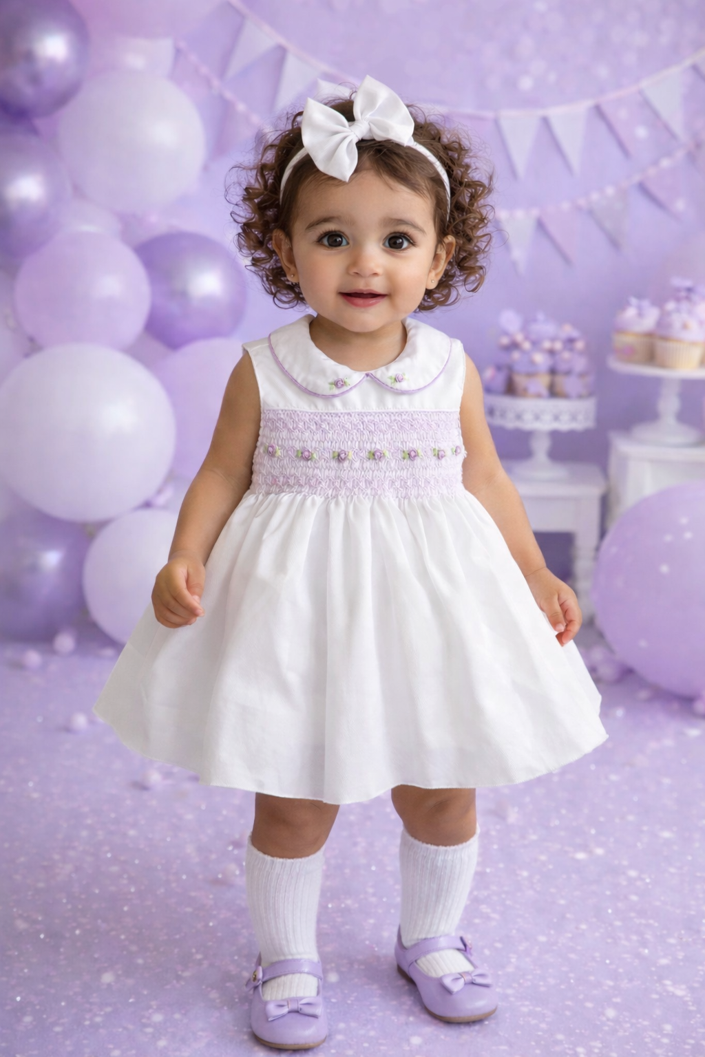 Beautiful sleeveless dress, fitted lined petticoat, white cotton with lilac hand smocked embroidery.