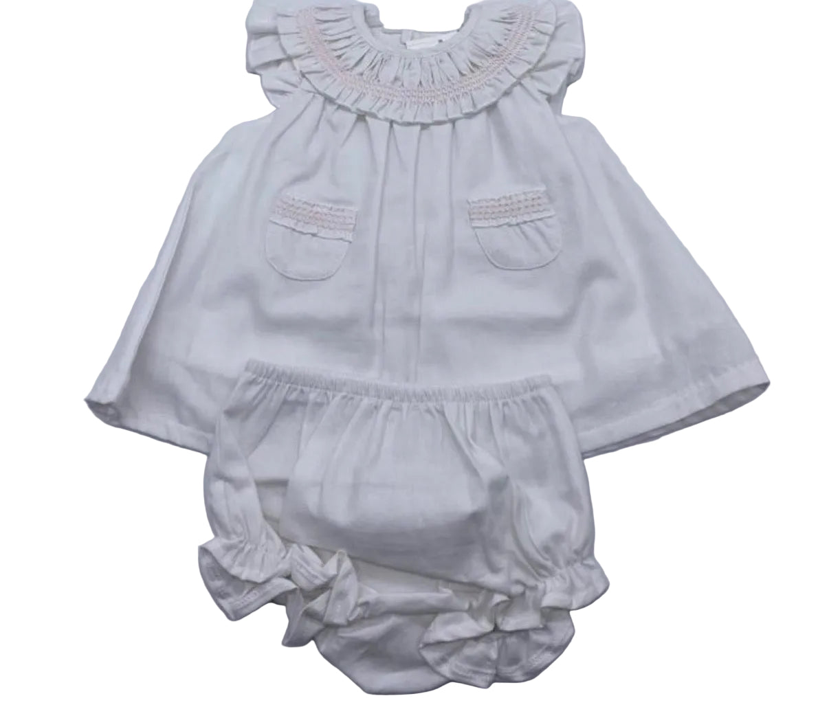 Pink and white smocked 2 piece cotton bloomer set.