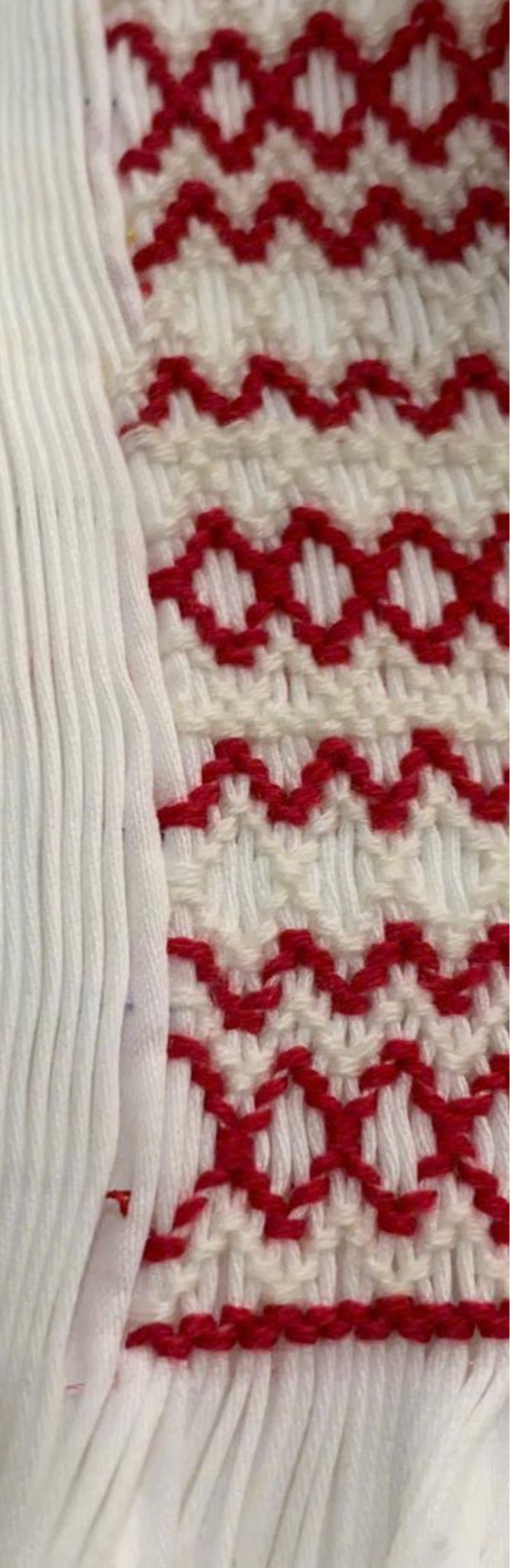 White Peter Pan collar shirt, dark red and cream smocking detail with winter cream jam pants.
