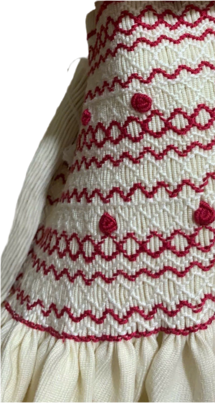 Luxury cream winter fabric with deep red hand smocked detail, includes pants & hairbows.